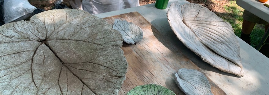On a beautiful Saturday morning, 13 appropriately-attired Driftwood Garden Club members attended a leaf birdbath making workshop at Long Hill Reservation in Beverly. The grounds at Long Hill were just gorgeous, and several members remarked on a number of improvements made since their last visit. Members worked together in a shady outdoor workshop led by Long Hill’s Senior Horticulturist, Dan Bouchard. DGC members brought leaves from their own gardens and were shown how to first set the leaf on a mound of sand, and then to mold a sandy concrete mixture against the back of the leaf to make an imprint of the veining on the bowl of the birdbath. The birdbaths are currently drying and will look just beautiful in our gardens. This was such an enjoyable workshop!