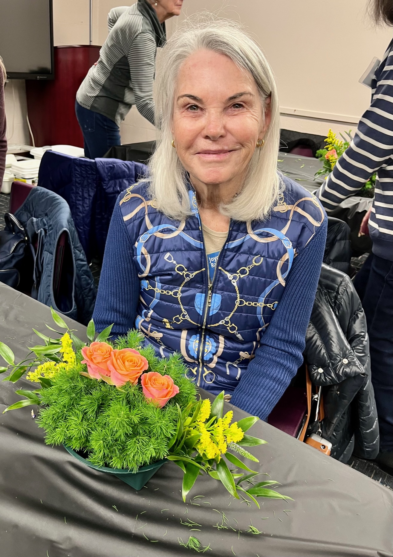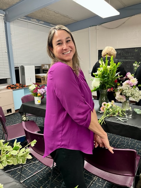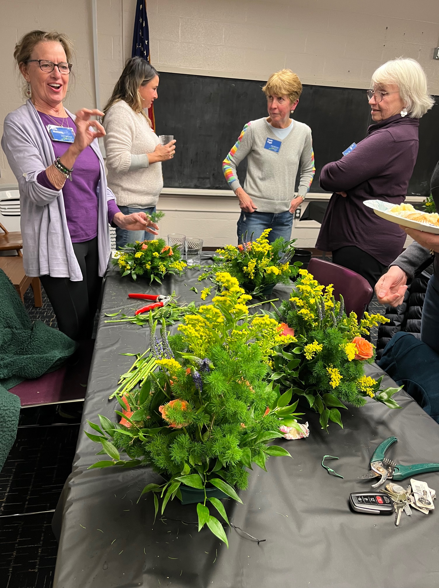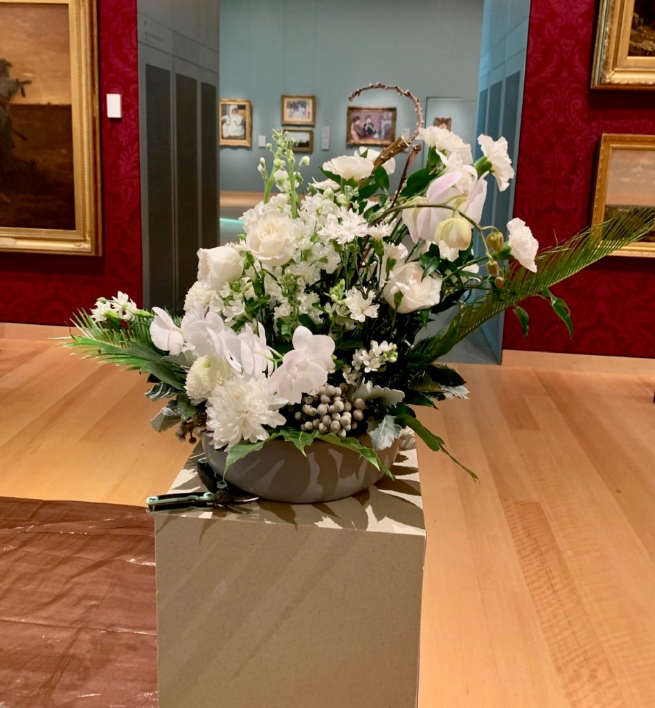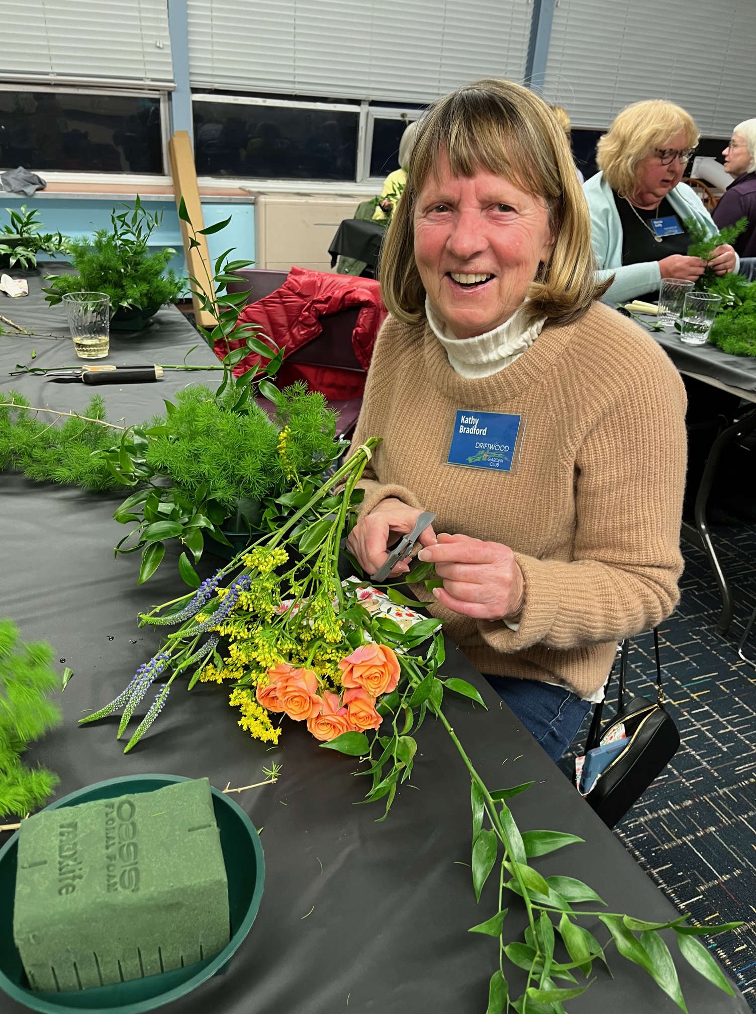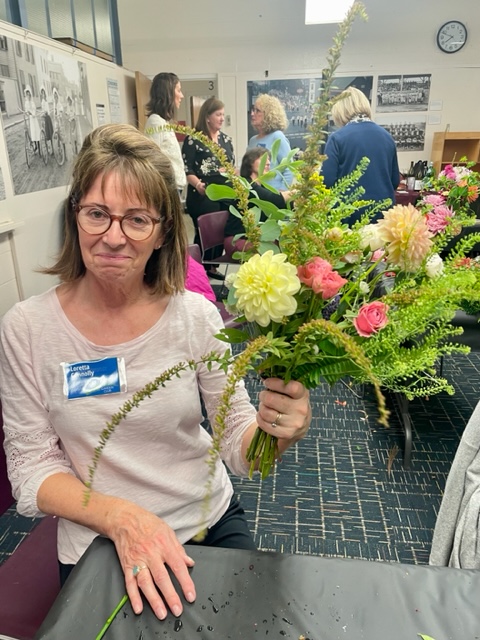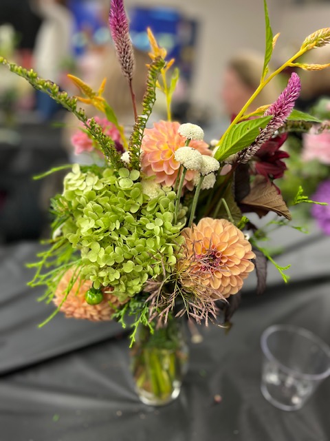 Although we all started with the same glass vases, every finished arrangement was unique. Some members subscribe to the ‘less is more’ philosophy, while others favor the ‘bigger is better’ style. Every floral arrangement had a different color palate and different fillers. In addition to the greenery supplied, many members brought in clippings from favorite plants in their own garden to make their arrangement personal and unique.